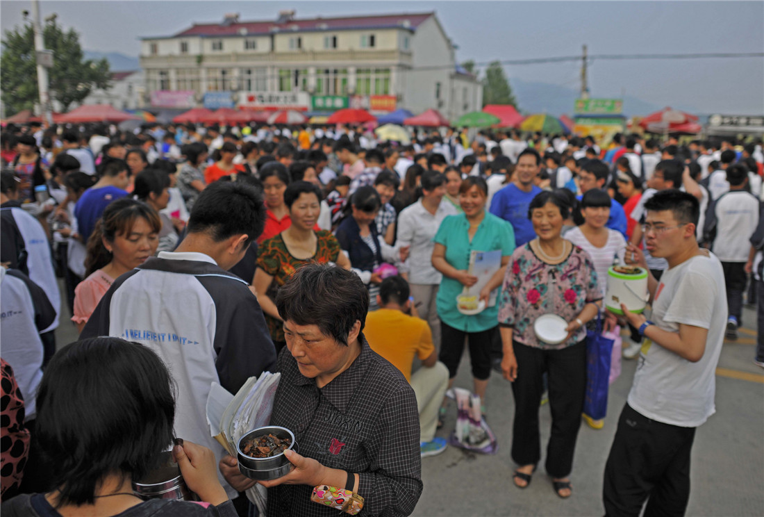 Students eat dinners brought by their parents outside Lu'an Maotanchang Middle School in Lu'an, Anhui Province on June 3, 2014. Parents deliver lunch and dinner to their children at the school so they can further concentrate on their studies. Photo: CFP figcaption >