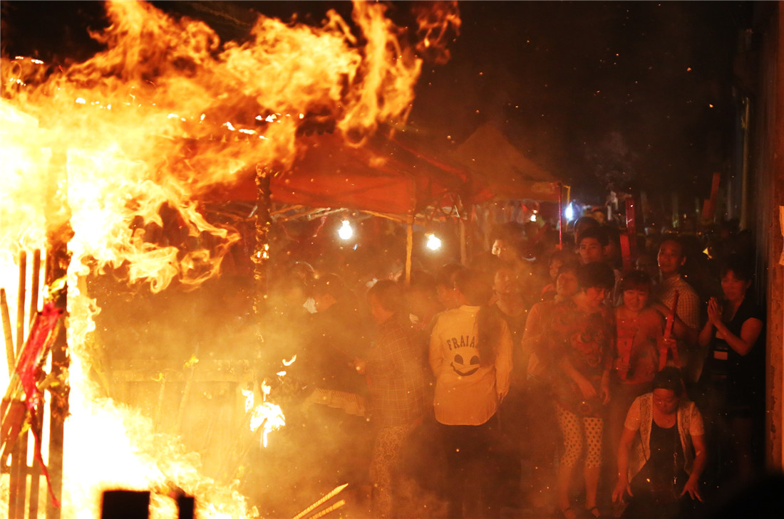 A fire sparked by crowds of parents making incense offerings burns outside the Lu'an Maotanchang Middle School on June 1, 2015. Photo: CFP figcaption >
