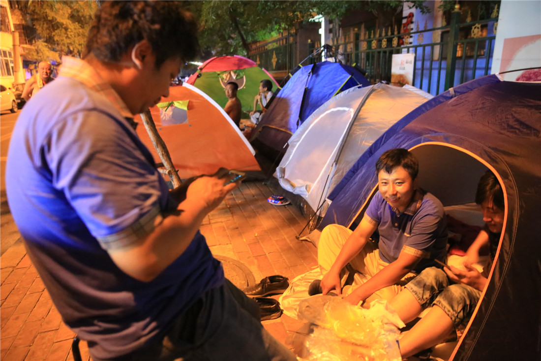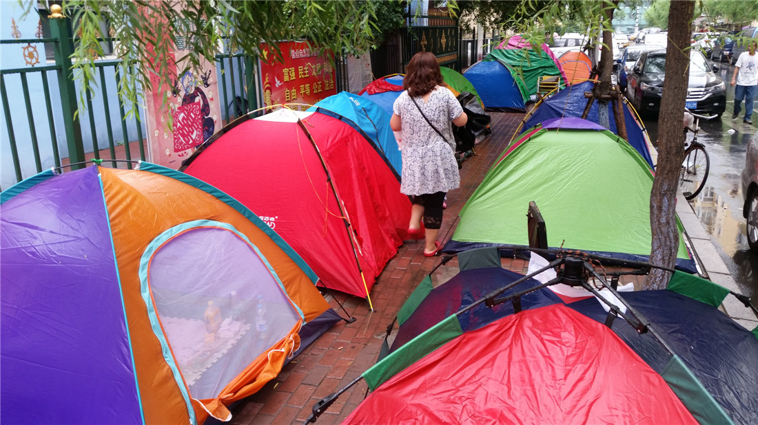 Parents camp outside a public kindergarten in Daoli district, Harbin, Heilongjiang Province on July 21, 2015 in order to secure their children a spot in the school. Some parents had lived in tents for three to four days to wait in line for enrollment on July 22. Most parents believe public schools offer better education and resources than private schools. Photo: CFP
