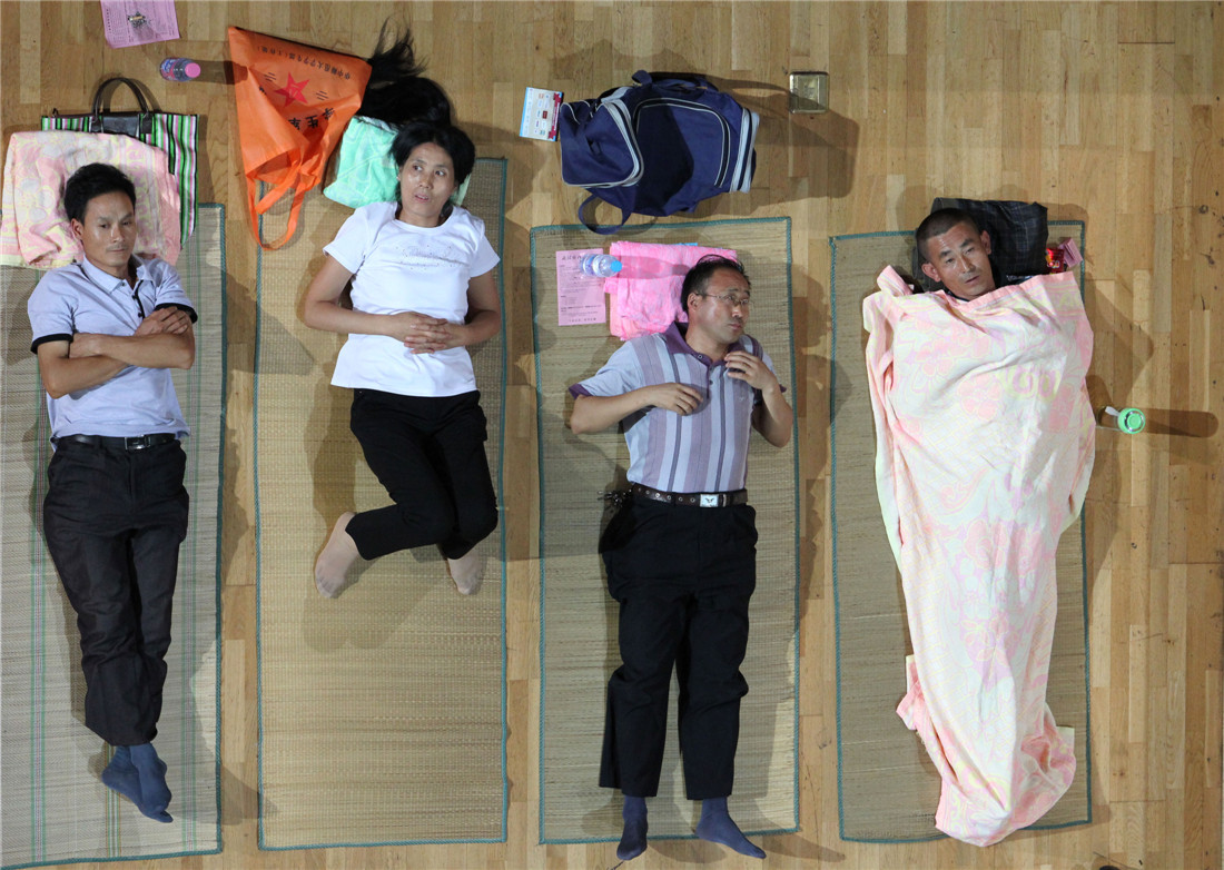 Parents sleep in the gymnasium of Central China Normal University in Wuhan, Hubei Province on September 3, 2014. Freshmen from around the country came to the school with their parents in tow to register. Central China Normal University opened the gym to the parents free of charge. Nearly 300 parents spent the night in the gym. Photo: CFP figcaption >