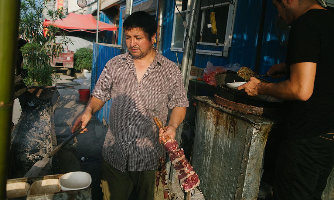 A Uyghur man prepares to roast mutton kebabs on July 28. The Uyghur businessmen normally trade jade in the morning and return to their neighborhoods to sell foods from their homeland in the afternoon. Photo: Li Hao/GT figcaption >