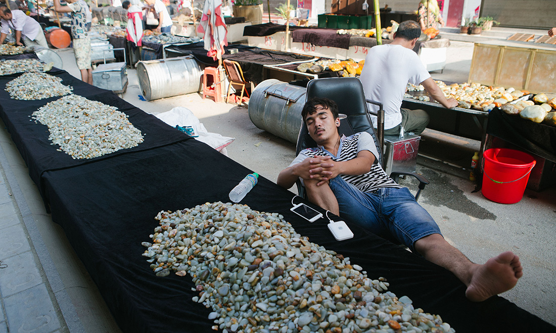 A Uyghur businessman takes a break in a warehouse storing raw jade on July 28. Photo: Li Hao/GT figcaption >