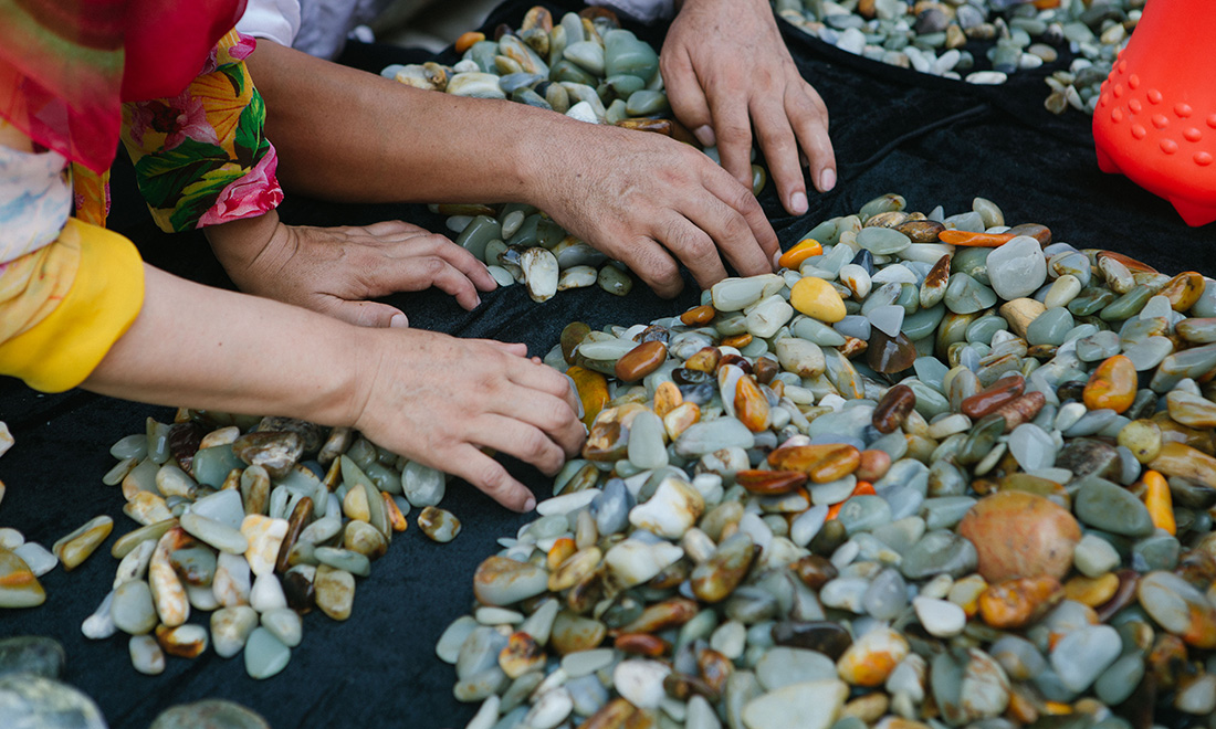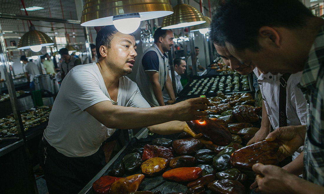A customer tries to identify the authenticity of the jade stones in front of a stall on July 30. Photo: Li Hao/GT figcaption >