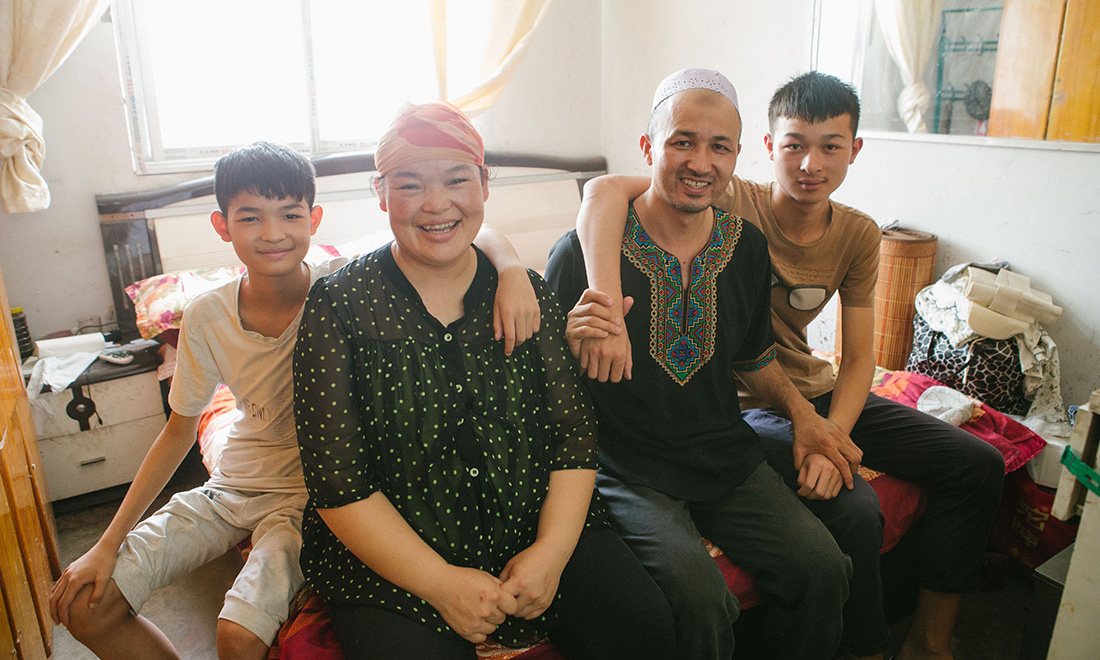 Anur (second from right), a jade stone dealer, poses with his family at their home on July 29. As the first Uyghur jade stone dealer in the township, Anur introduced many other Uyghurs to do business here. He since married a Han Chinese woman and has two sons. Photo: Li Hao/GT figcaption >