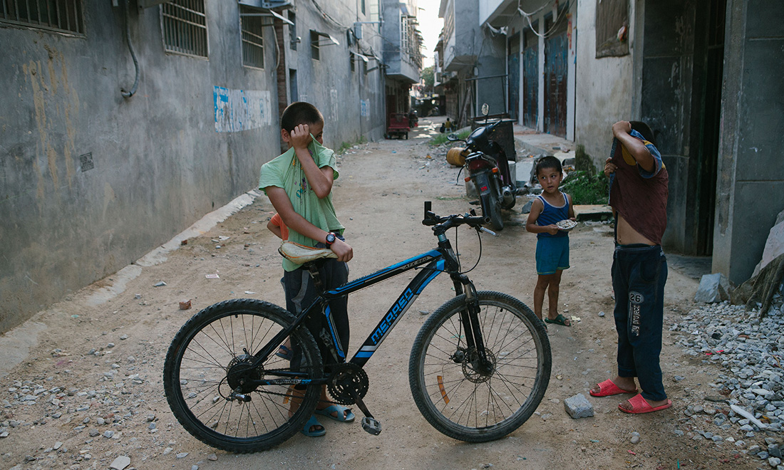 Three Uyghur children play in their neighborhood on July 28. Photo: Li Hao/GT figcaption >