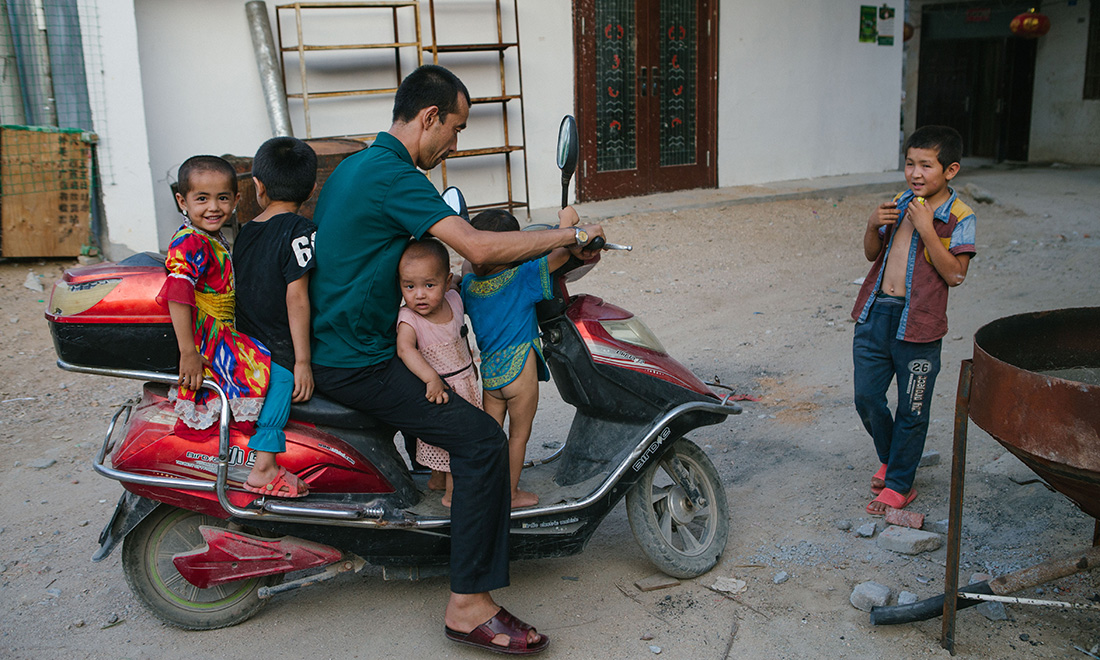A Uyghur man readies to ride an e-bike with his children on July 28. Photo: Li Hao/GT figcaption >