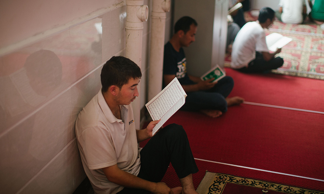 A Uyghur Muslim reads a book before prayer on July 31. Photo: Li Hao/GT figcaption >