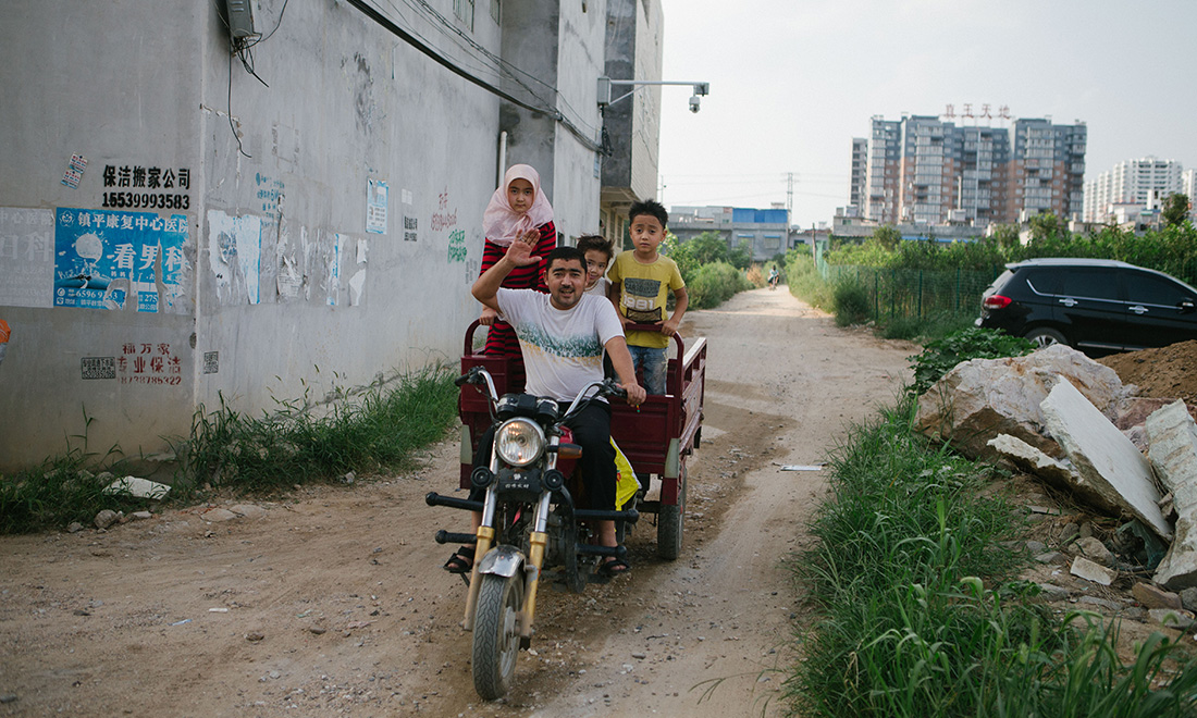 A Uyghur businessman and his family ride a motorized tricycle near their home in Shifosi township on July 28. Photo: Li Hao/GT figcaption >