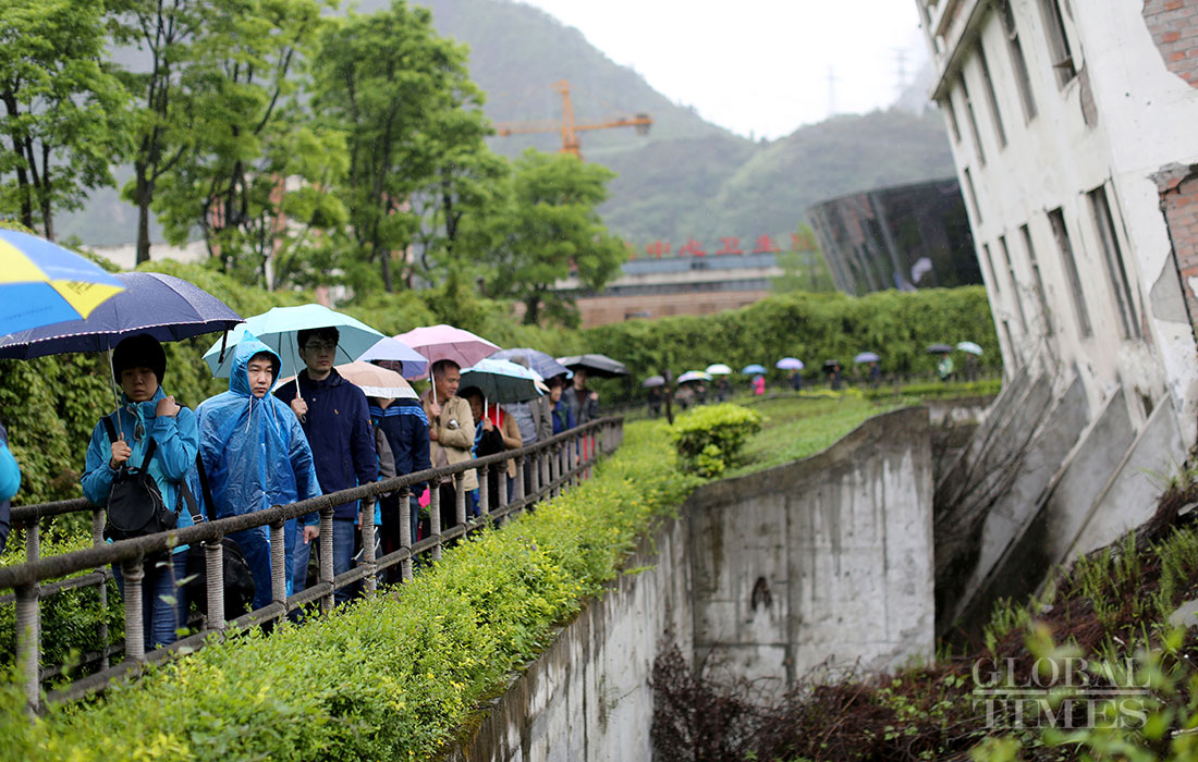People wait in the rain so as to pay a visit to the Memorial Hall of Wenchuan Earthquake Epicenter in Yingxiu, Wenchuan county, Sichuan Province. Photo: Yang Hui/GT figcaption >