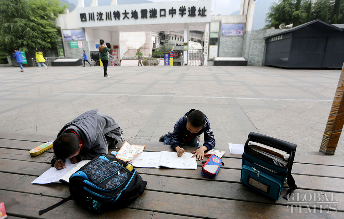 Students do their homework in front of the earthquake memorial site of Xuankou Middle School at Yingxiu, Wenchuan County, in SW China’s Sichuan Province. Photo: Yang Hui/GT figcaption >