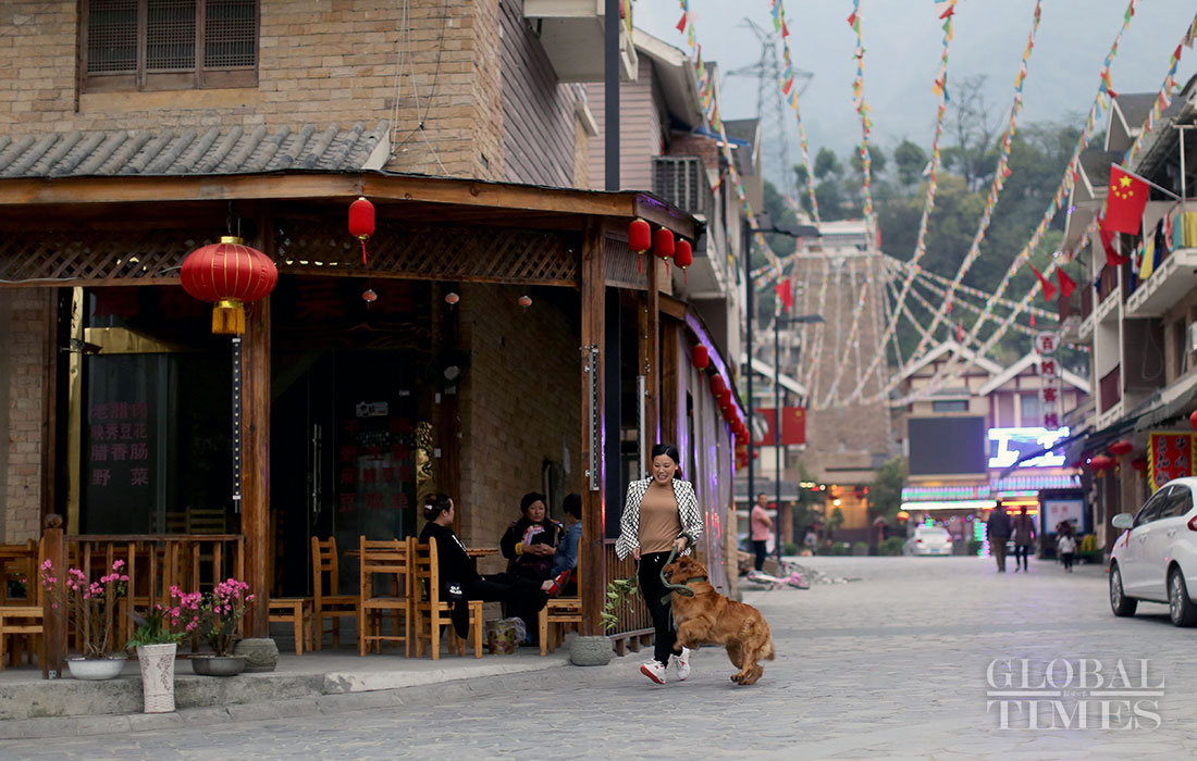 A woman walks a dog at dawn in Yingxiu, Wenchuan County, SW China’s Sichuan Province. Photo: Yang Hui/GT figcaption >