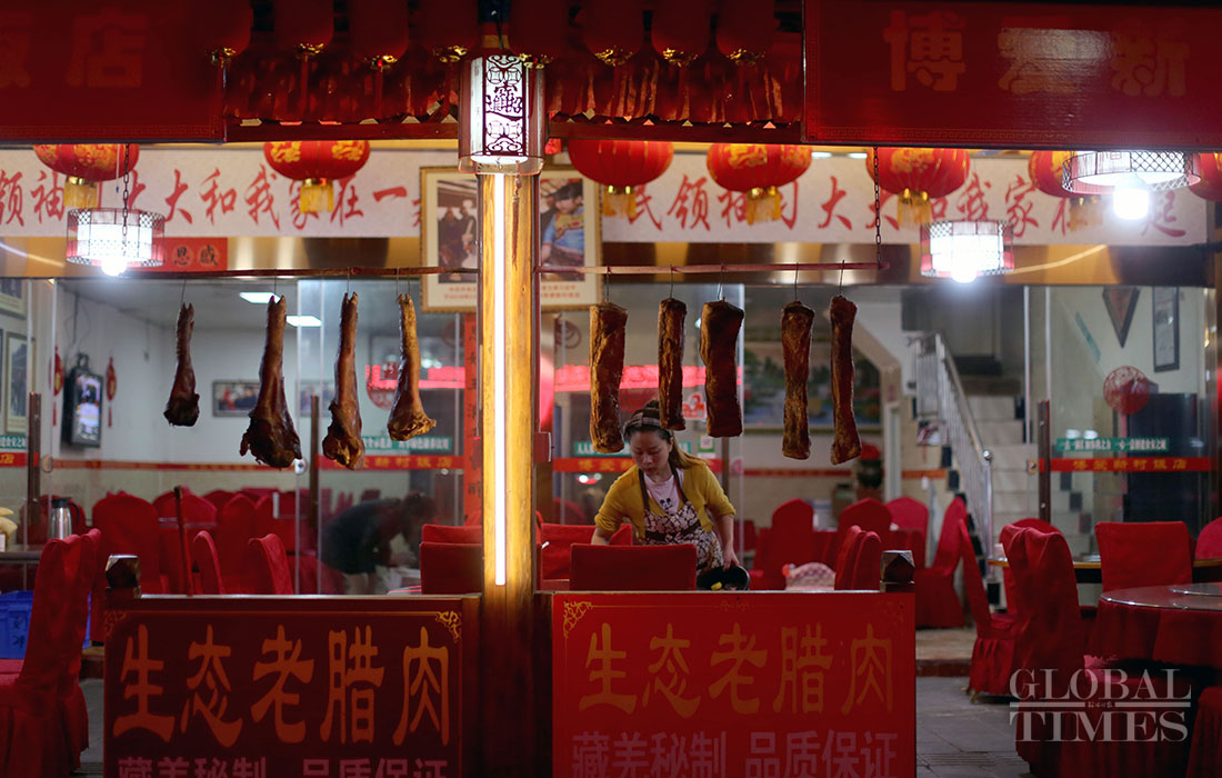 A small restaurant with Chinese Bacon hanging at the front entrance is preparing to close for the night. Photo: Yang Hui/GT figcaption >
