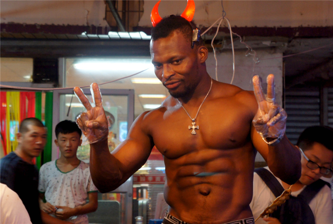 A hamburger stand owner shows off his muscles at a night market in Shenyang, Liaoning Province on August 12, 2014. Photo: CFP figcaption >
