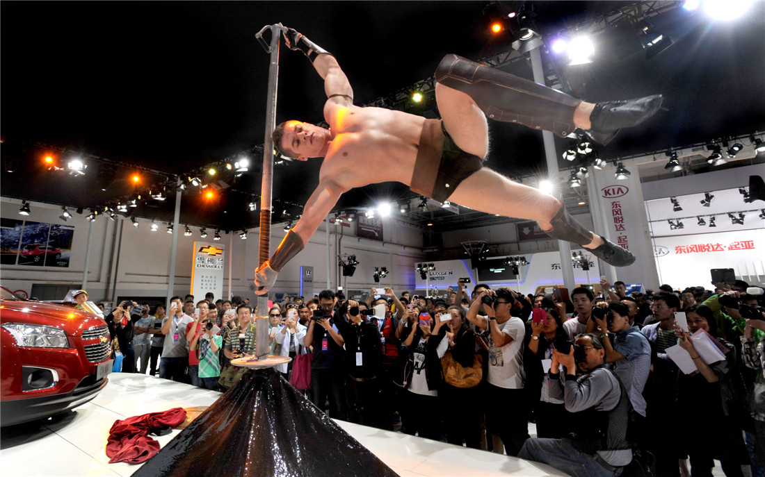 A male foreign model pole dances during an auto show in Qingdao, Shandong Province on May 15, 2014. Photo: CFP figcaption >