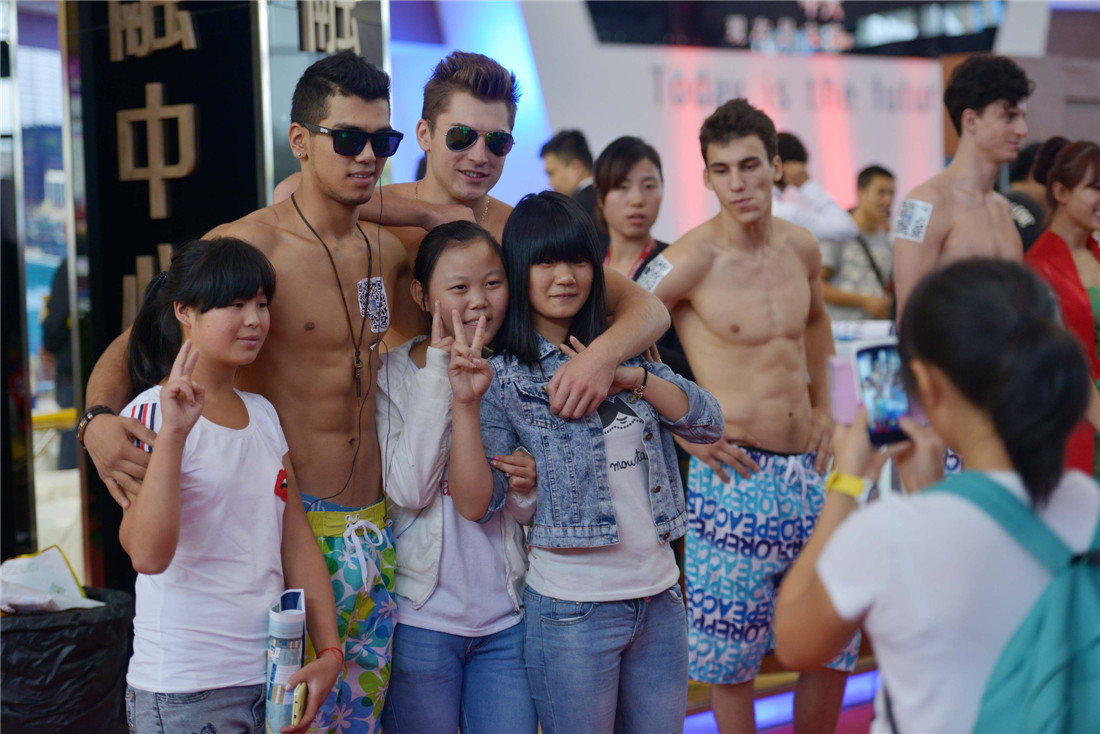 Young women pose for group photos with male models at a real estate trade fair in Guiyang, Guizhou Province on September 20, 2015. Photo: CFP figcaption >