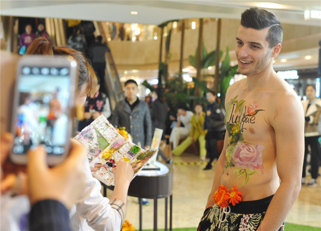A male foreign model in body paint poses for photos as part of promotion at a shopping mall in Nanjing, Jiangsu Province on April 6, 2015. Photo: CFP