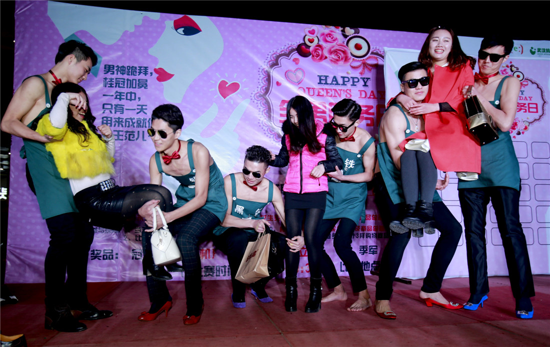 Male models wearing high-heels lift three shoppers during a Women's Day promotion at a shopping center in Wuhan, Hubei Province on March 8, 2015. Photo: CFP figcaption >