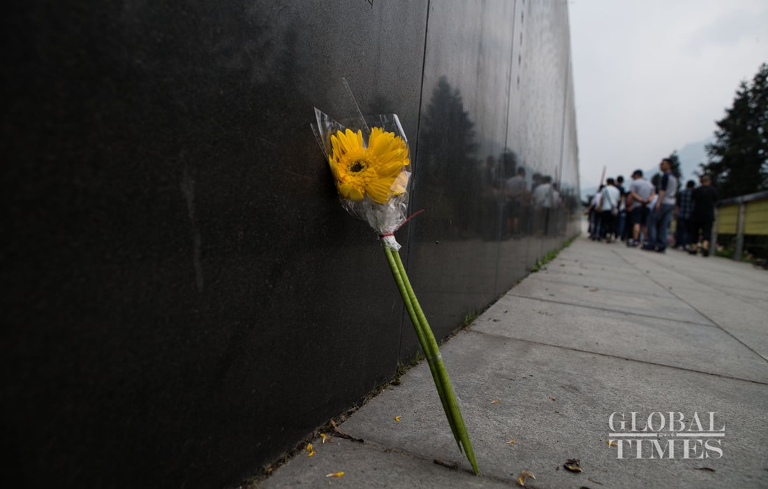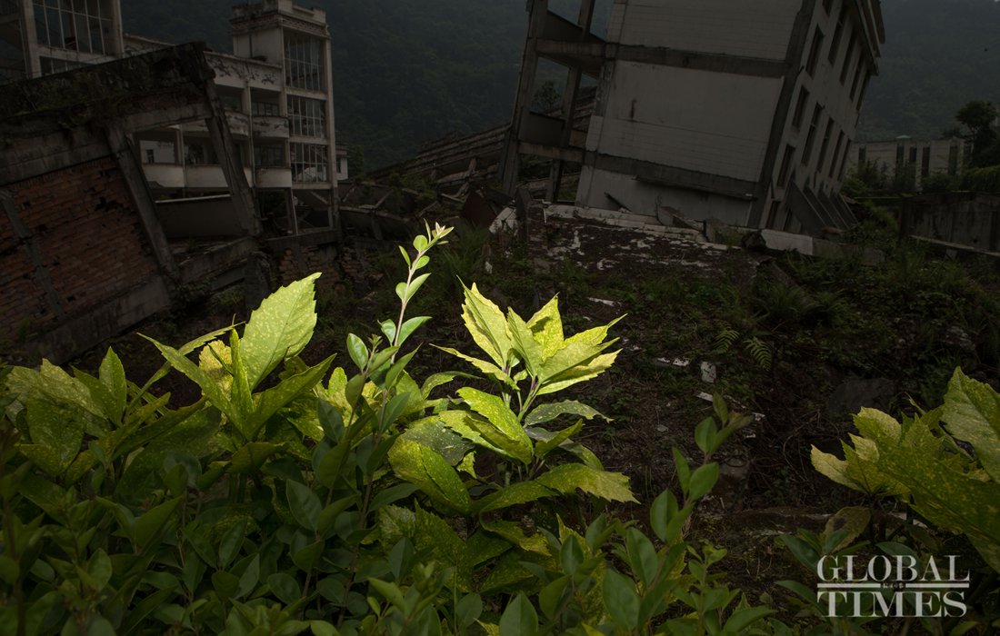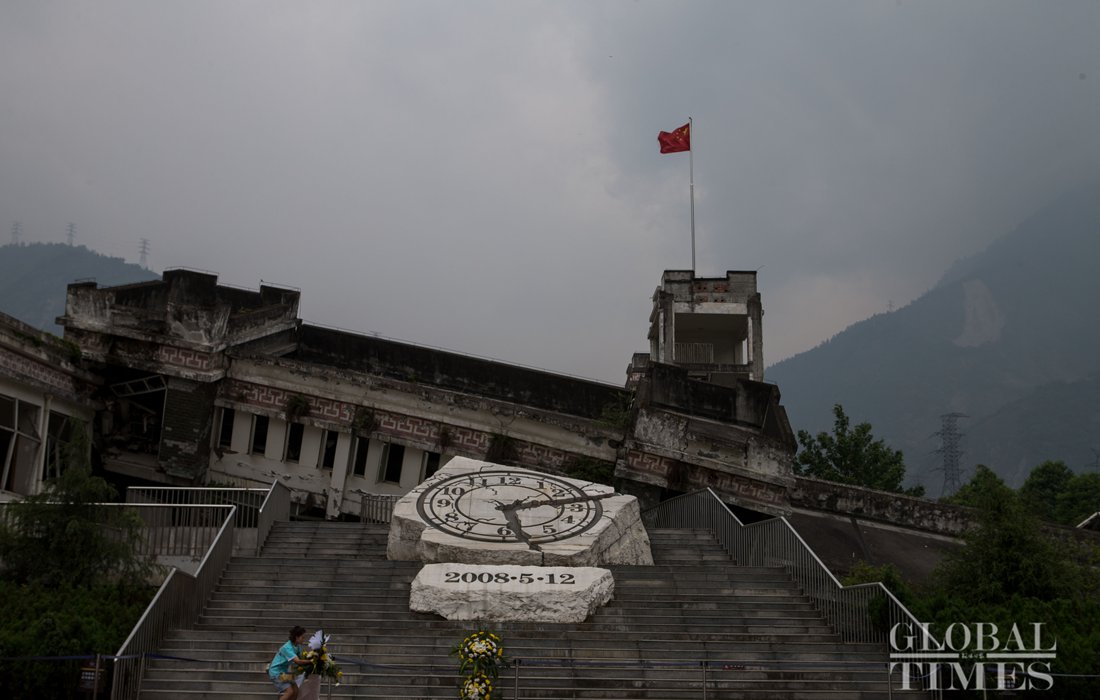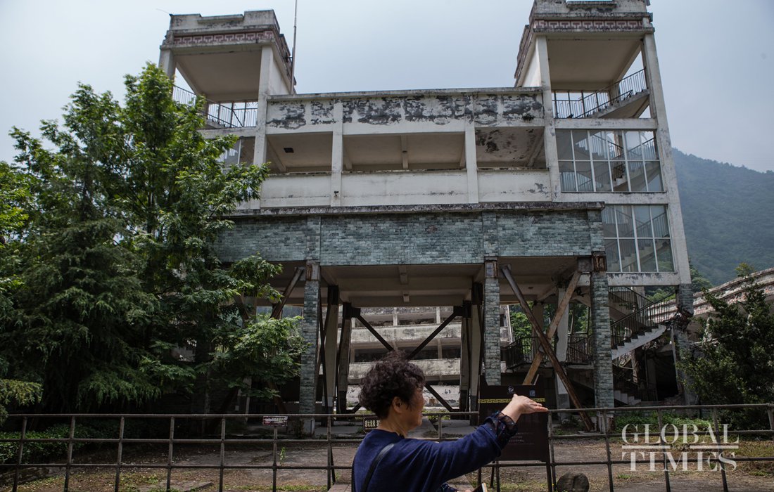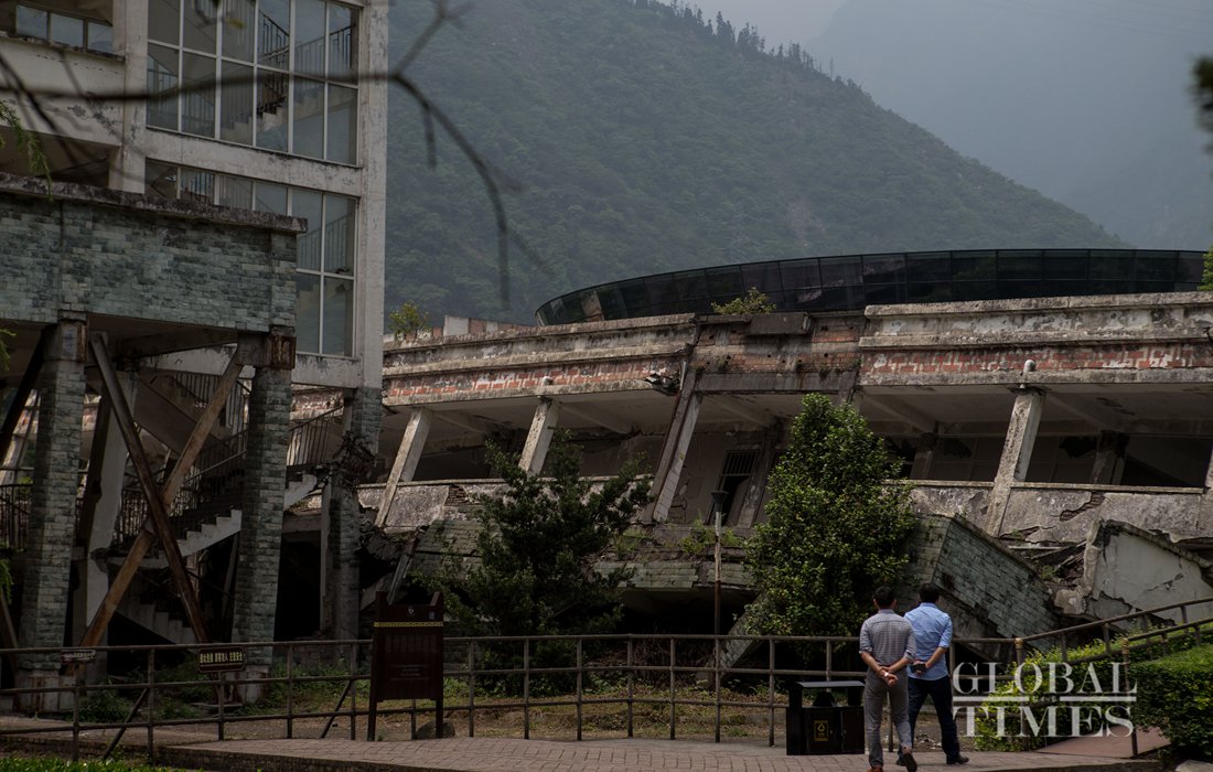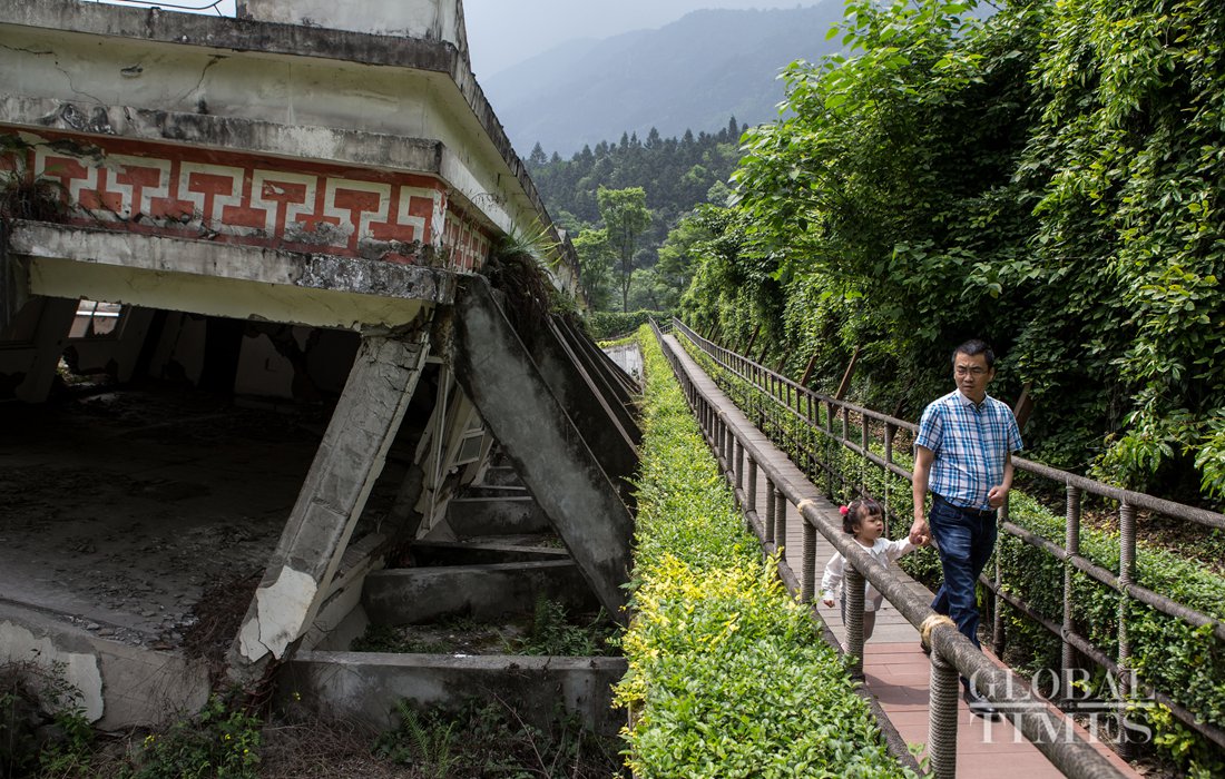 Two visitors look at the remains of Xuankou Middle School in Yingxiu, Southwest China’s Sichuan Province on May 5. The town was the epicenter of the 2008 Wenchuan earthquake. Now it has been rebuilt, and Xuankou Middle School, located at the heart of the town, has become a public memorial and earthquake museum. (Photo: Li Hao/GT)