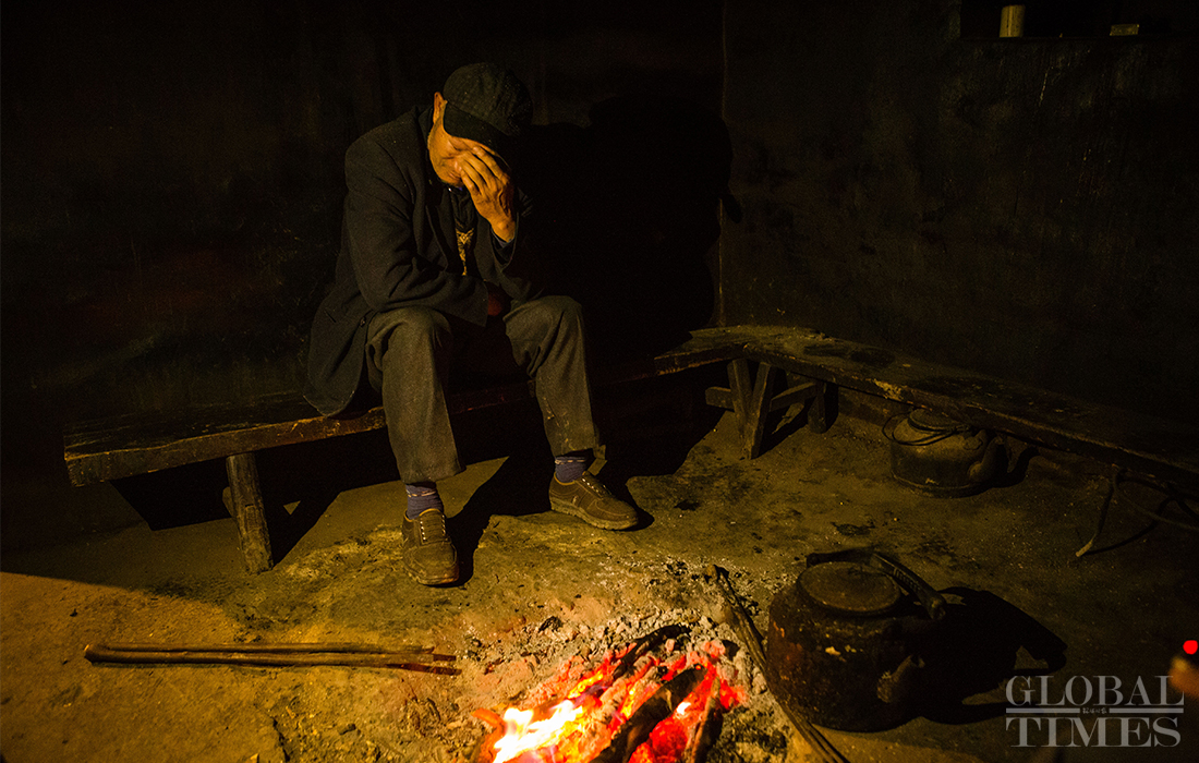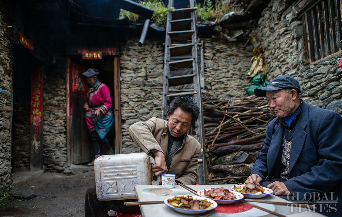 Former village leader Yang Decheng and others who chose to stay behind eat and drink in Xige village. Photo: Li Hao/GT figcaption >