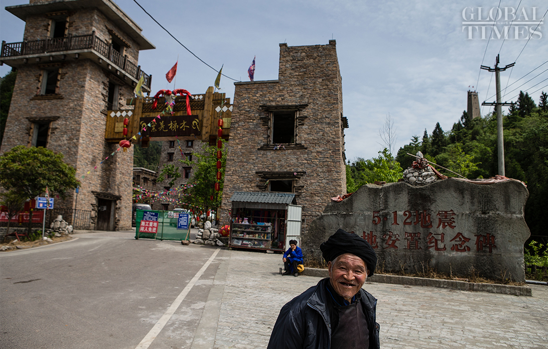 An old man walks past a monument to the 2008 Wenchuan earthquake in front of the newly constructed Qiang village in Qionglai. Photo: Li Hao/GT figcaption >