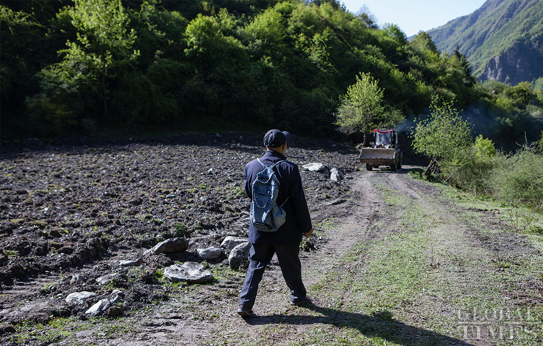 Yang Decheng, Xige village’s former leader, walks down the road. In the distance is an excavator heading to the village to work on rebuilding it. Photo: Li Hao/GT figcaption >