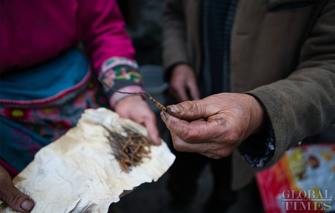 Villagers who stayed behind gather wild yams and chongcao (caterpillar fungus), both important sources of income for Xige village. Photo: VCG figcaption >