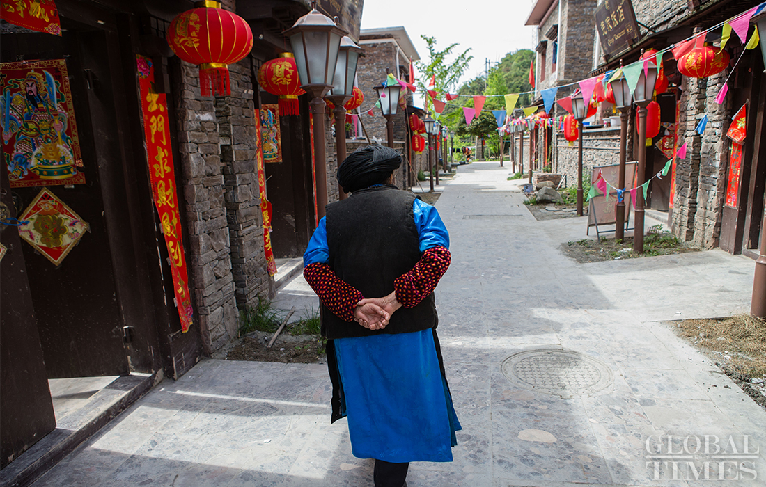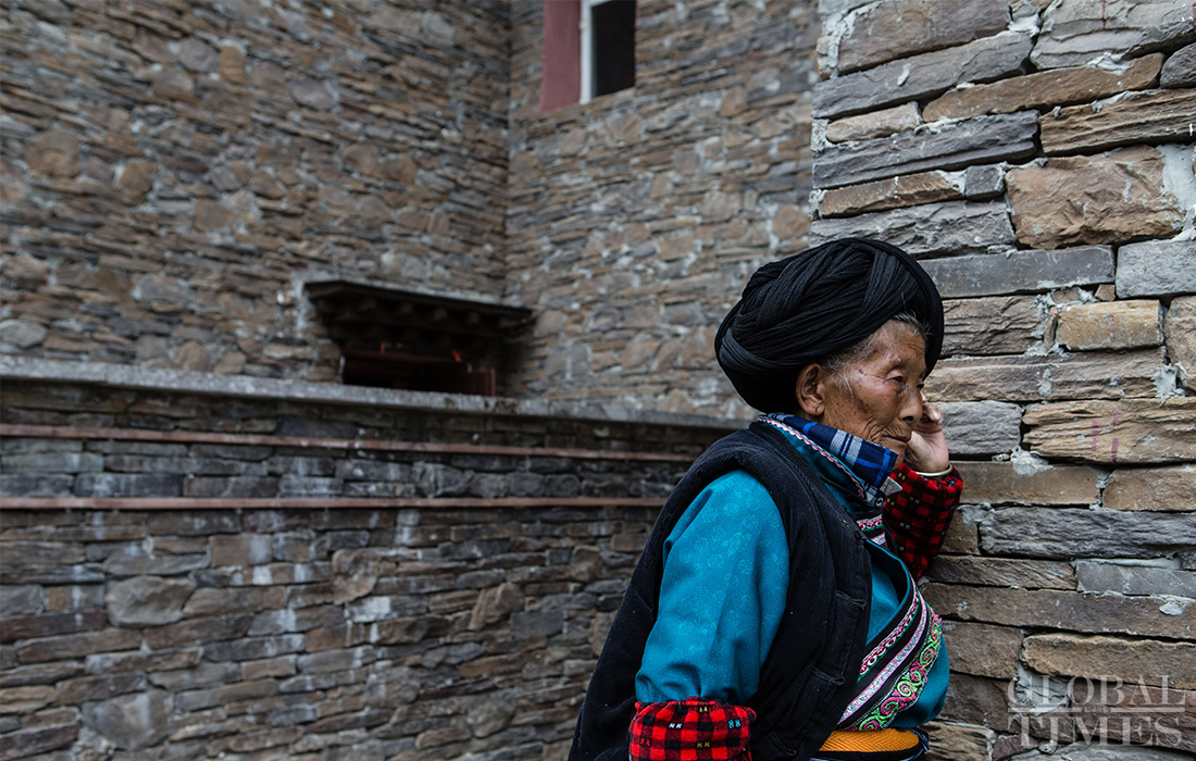 An old woman stands in a yard in the Qiang people’s new village, which was reconstructed in Qionglai after the 2008 Wenchuan earthquake. Photo: Li Hao/GT figcaption >