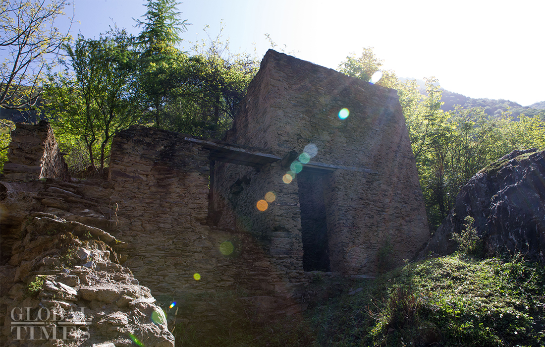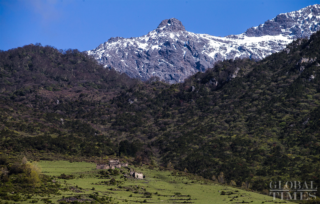 The remains of Xige Village sit below a snowy mountain that stands more than 4,000 meters tall. Photo: Li Hao/GT figcaption >