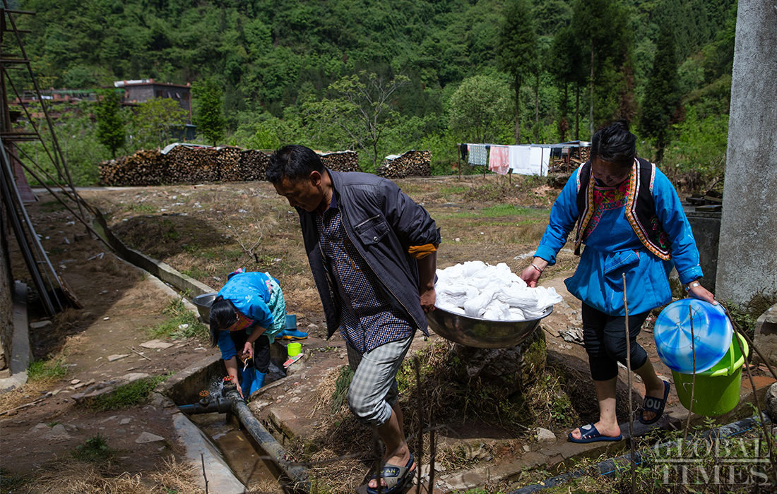Locals wash bed sheets for tourists with mountain spring water in the new village of Qionglai. Photo: Li Hao/GT figcaption >