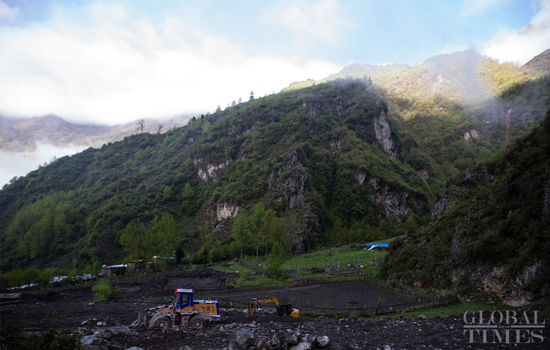 Construction equipment works on an area of the old Qiang village of Xige, where Wenchuan contractors are developing land for agriculture and tourism. Photo: Li Hao/GT figcaption >