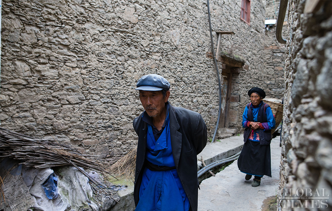 A couple of elderly Qiang people walk down a street in Kuapo village, another old Qiang village. Photo: Li Hao/GT figcaption >