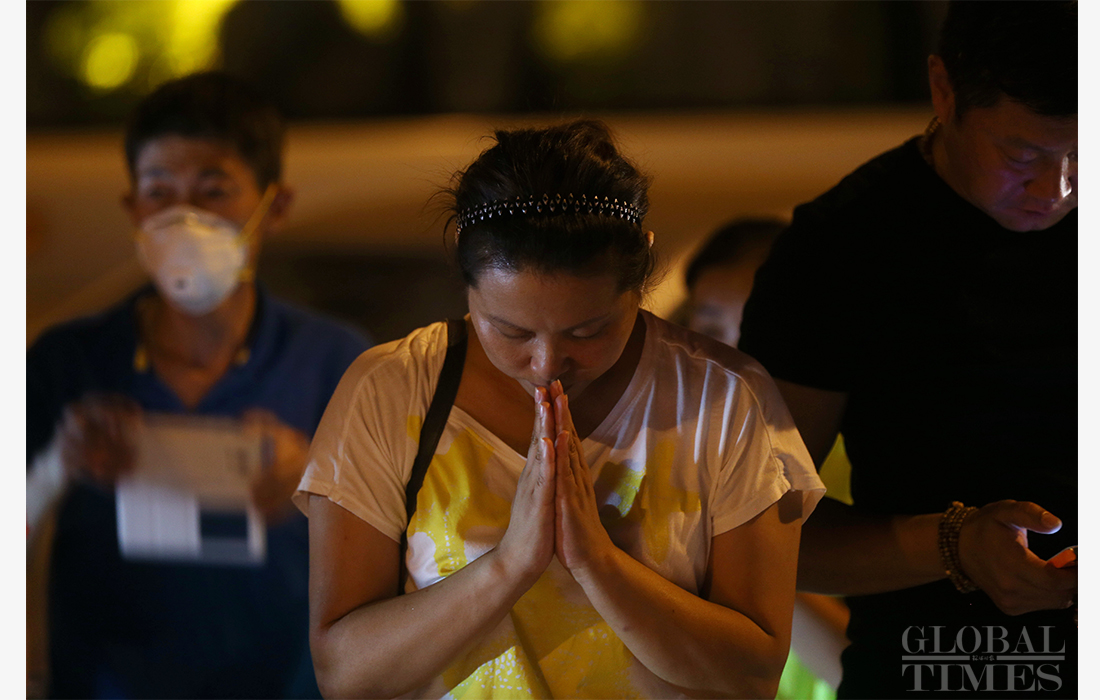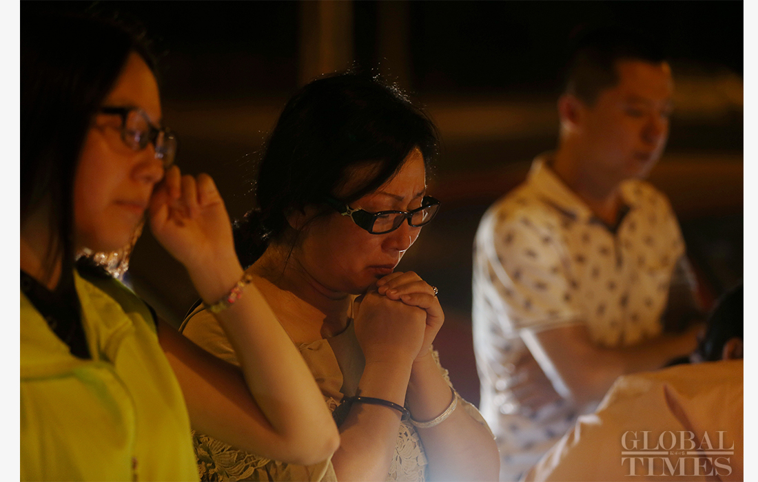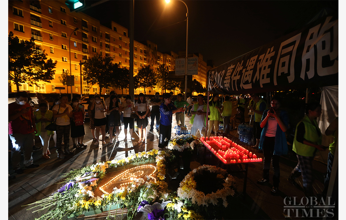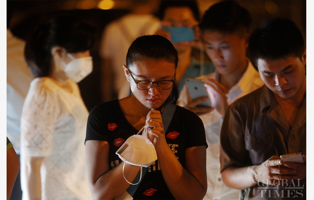 Crowds pray and hold vigils in front of Teda hospital and at a square for the victims of the Tianjin explosions on Sunday night. Passing vehicles honked their horns to pay homage. Photo: Cui Meng/GT