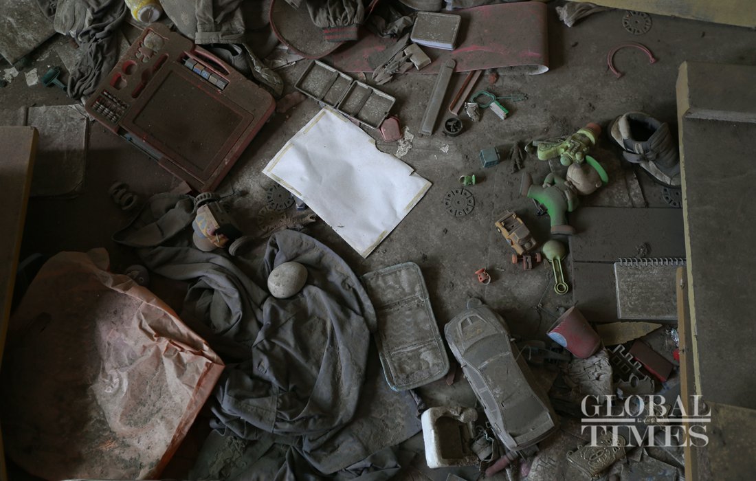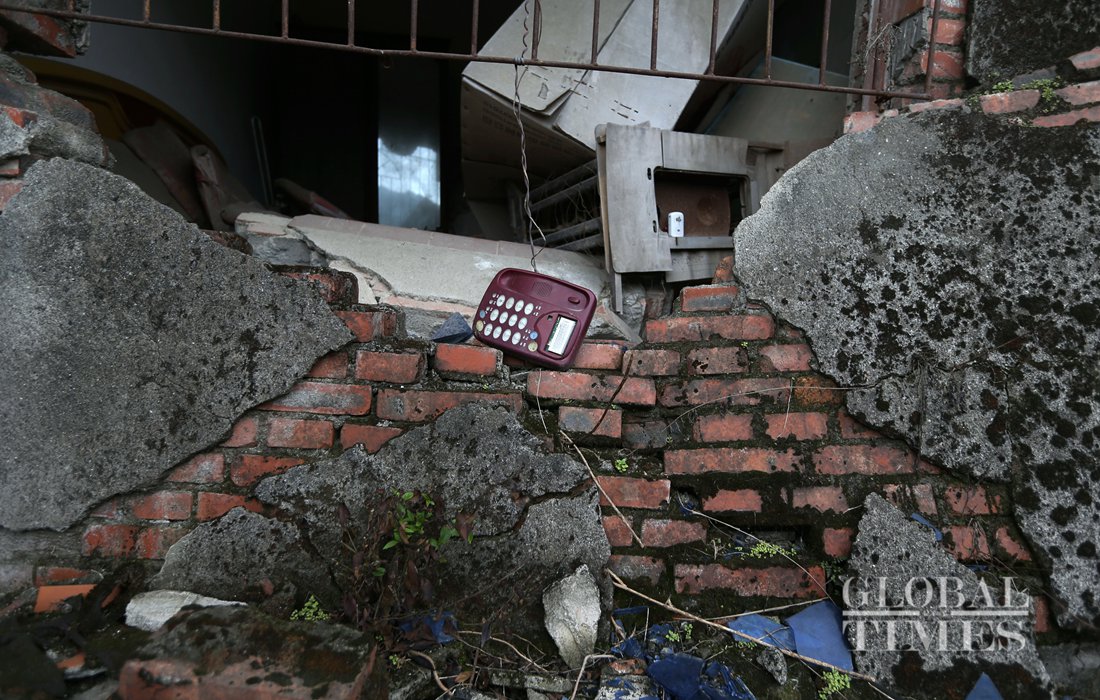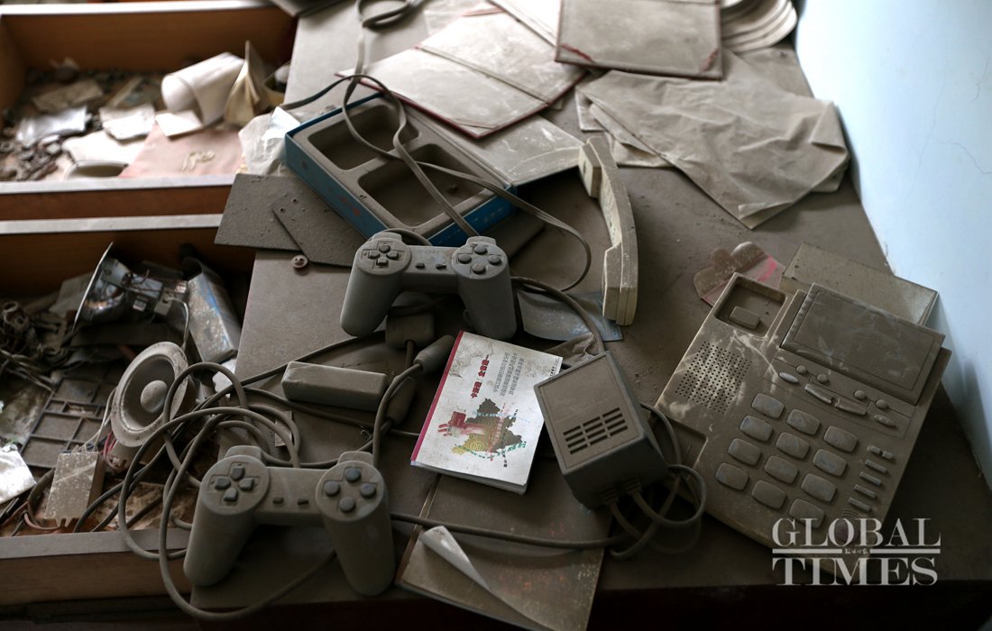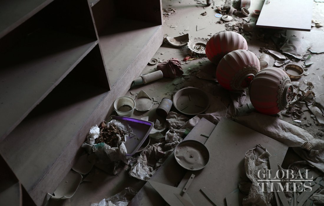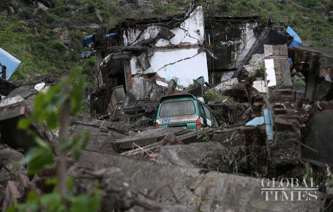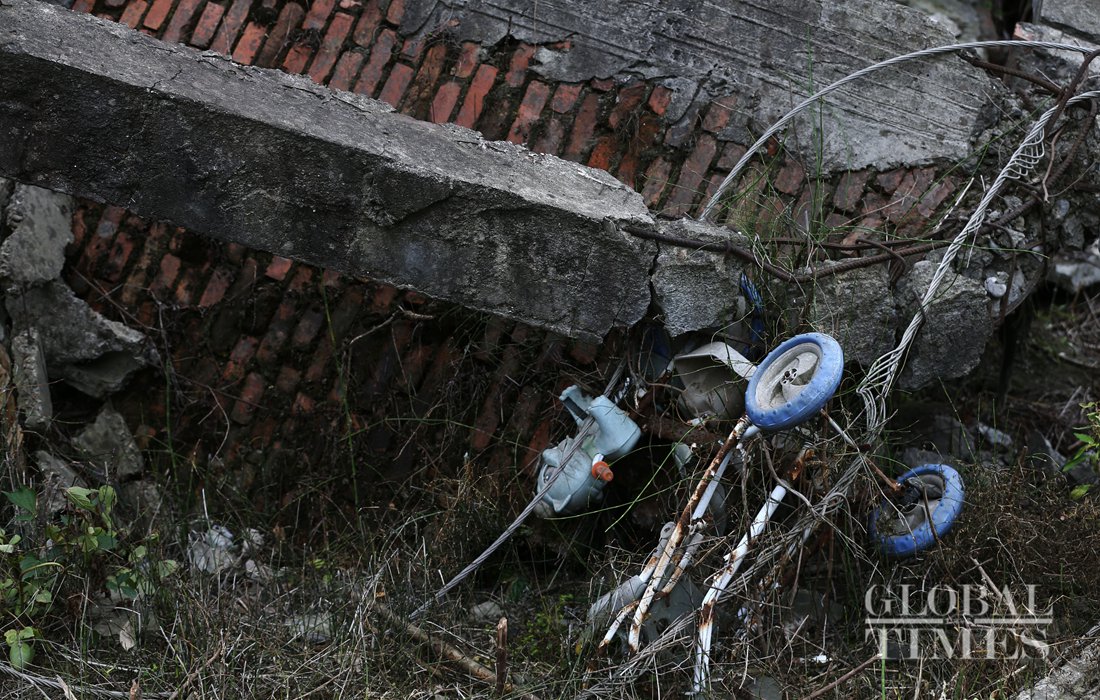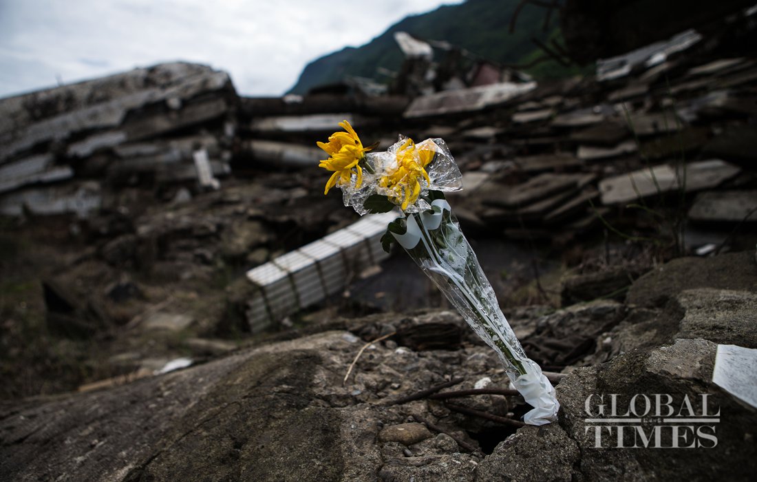 Chrysanthemums were placed among the ruins of Wenchuan earthquake in the old Beichuan County. Photo: Li Hao/GT figcaption >