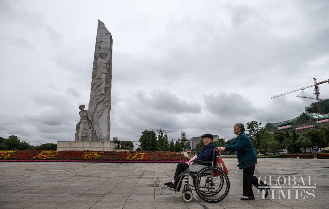 Two elders stroll pass the Wenchuan Earthquake monument in the new Beichuan County on May 11. Photo: Li Hao/GT figcaption >