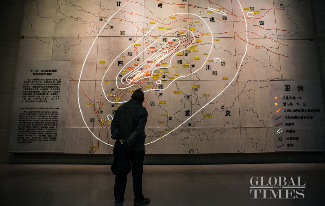 A visitor looks at a map in the Wenchuan Earthquake Memorial Museum. The map shows the areas damaged by the Wenchuan earthquake. Photo: Li Hao/GT figcaption >