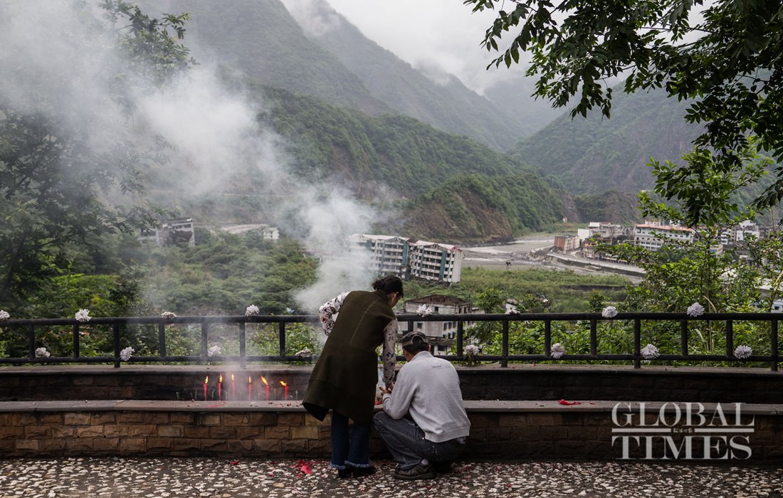 A couple burns paper in memory of their family members who died in the Wenchuan earthquake 10 years ago. Photo: Li Hao/GT figcaption >