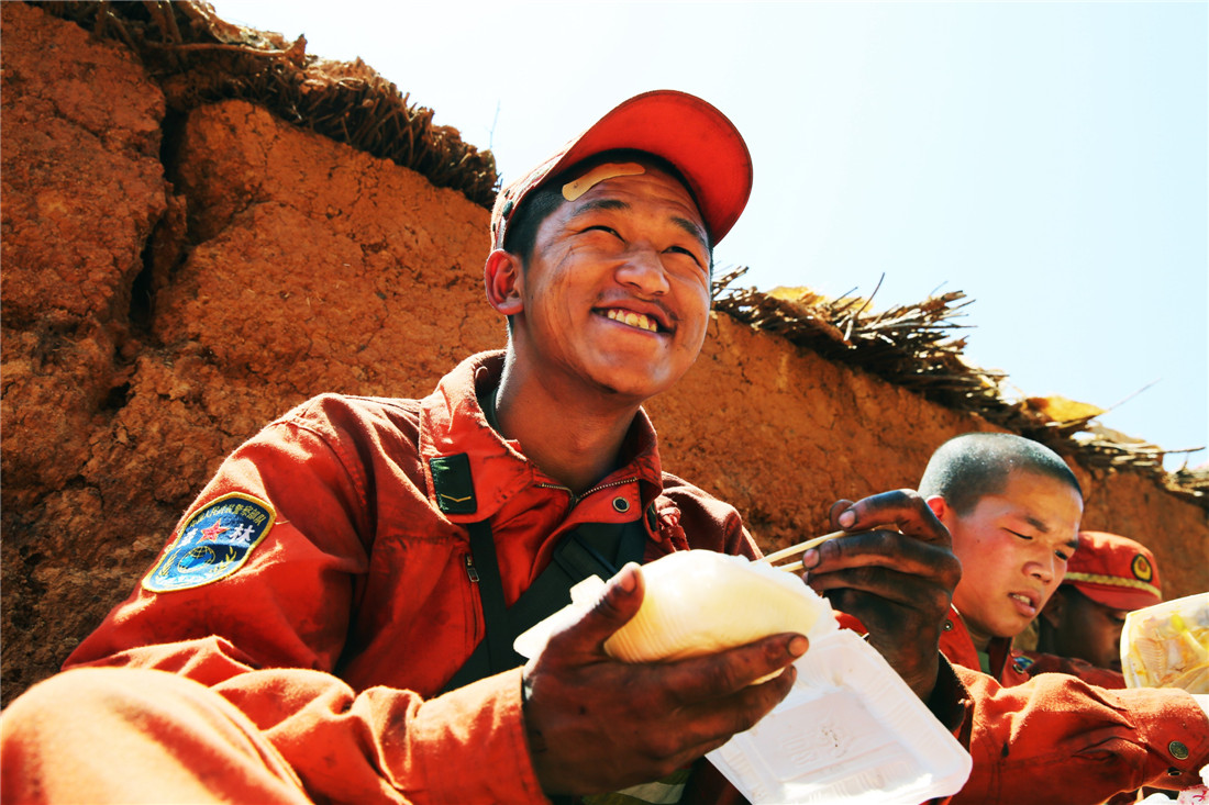 A firefighter eats a hard-earned meal after extinguishing a large forest fire in Xichang, Sichuang Province on April 19, 2014. The fire took three days and nights of constant work to extinguish. Photo: CFP figcaption >