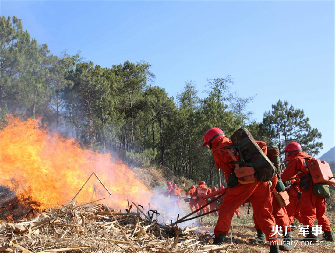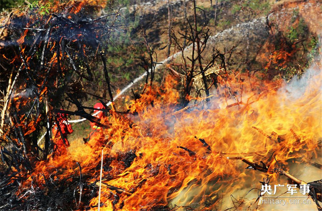 Firefighters extinguish a controlled fire during a drill. Photo: cnr.cn