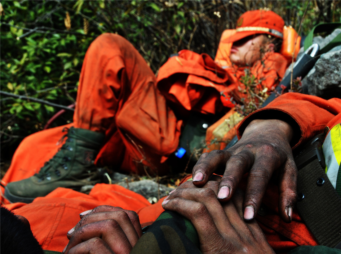 Firefighters rest in the forest after extinguishing a blaze on February 16, 2014 in Mianning county, Liangshan Yi Autonomous Prefecture. Their hands were blackened by the fire. Photo: CFP figcaption >