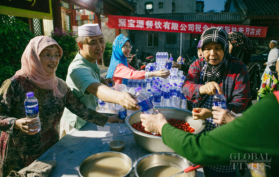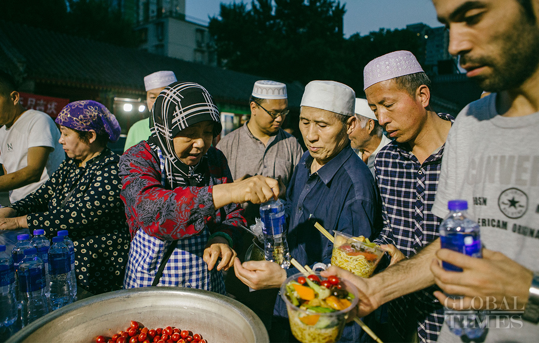 Volunteers hand out food for people breaking fast at sunset. Photo: Li Hao/GT figcaption >
