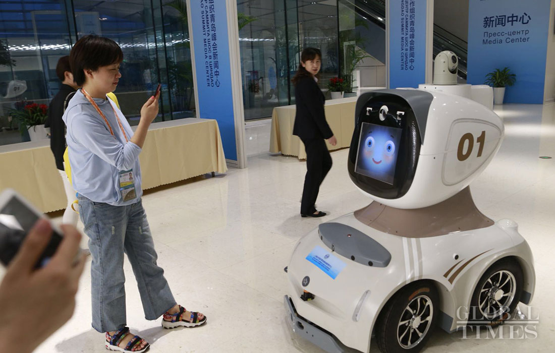 With the approach of the Shanghai Cooperation Organization (SCO) Qingdao Summit, volunteers provide assistance for international journalists at the media center that formally opened on June 6. Its services include transportation, medical care and security. The media center also boasts welcome robot “66”, security robot “Haihai” and delivery robot “Dian Xiaoer.” Security robot “Haihai” can carry out 24-hour autonomous patrols and follow-up surveillance of suspicious persons and items. It can also scold people who walk on the grass and post advertisements. (Photos: Li Hao/GT)