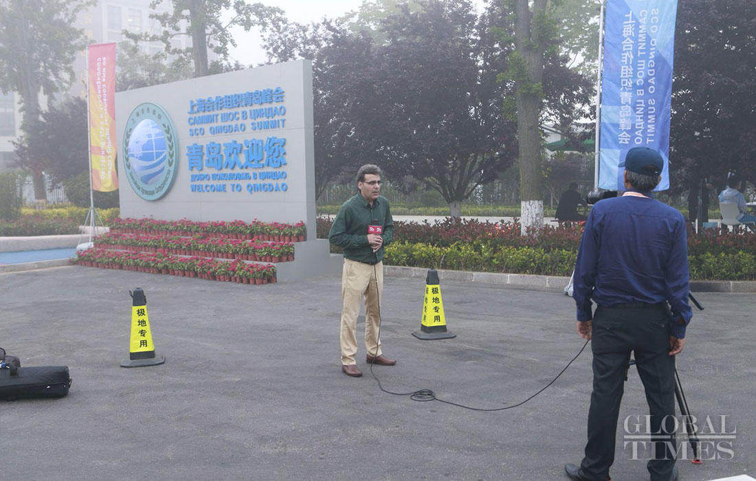 A journalist reports outside the media center of the 18th Shanghai Cooperation Organization Summit in Qingdao, East China's Shandong Province, on June 7, 2018. Photo: Li Hao/GT figcaption >