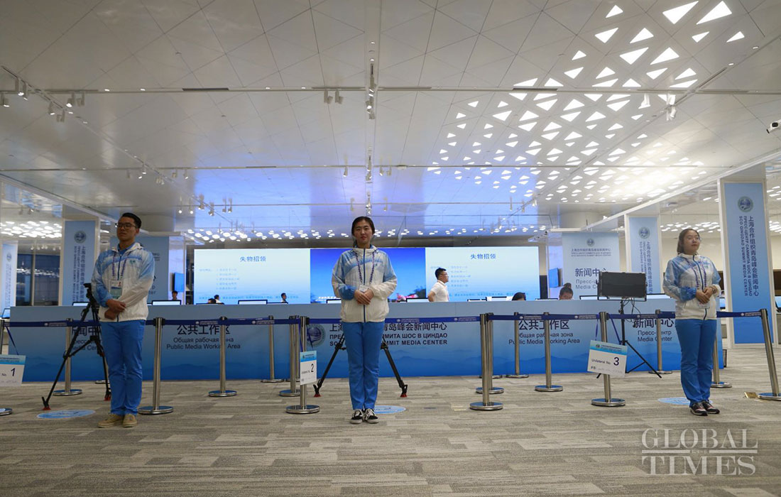 Volunteers stand at attention in the media center for the 18th Shanghai Cooperation Organization Summit in Qingdao, East China's Shandong Province, on June 7, 2018. Photo: Li Hao/GT figcaption >