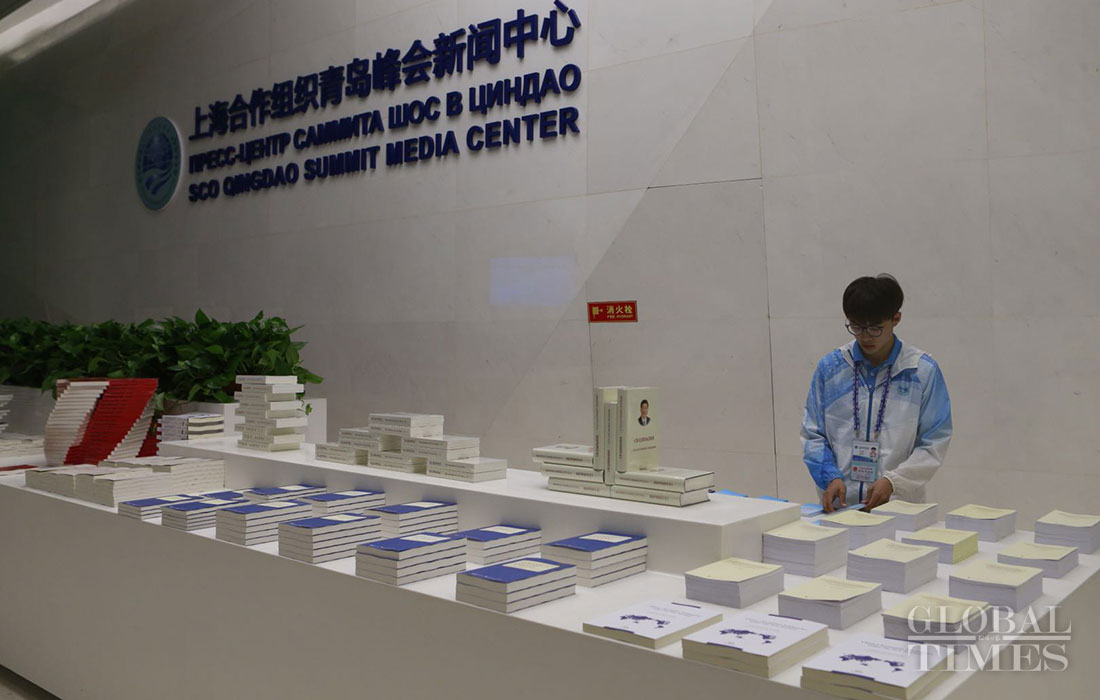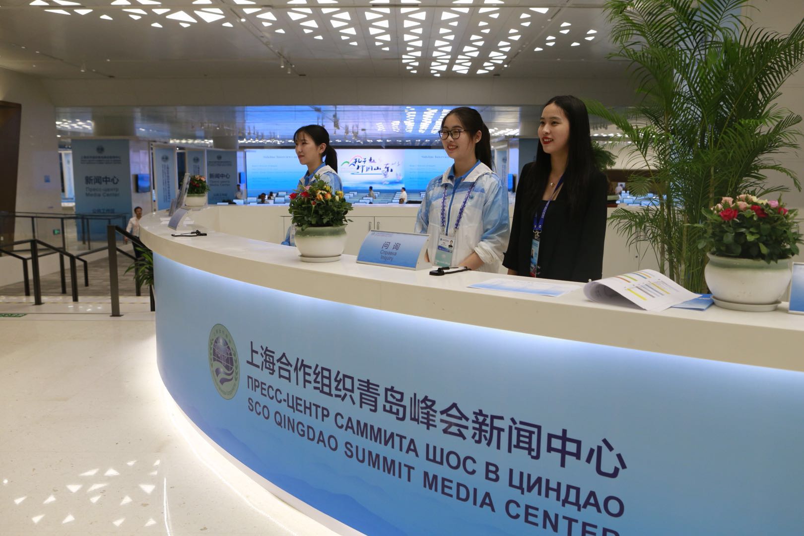 Volunteers work at the media center reception desk of the 18th Shanghai Cooperation Organization Summit in Qingdao, East China's Shandong Province, on June 7, 2018. Photo: Li Hao/GT figcaption >