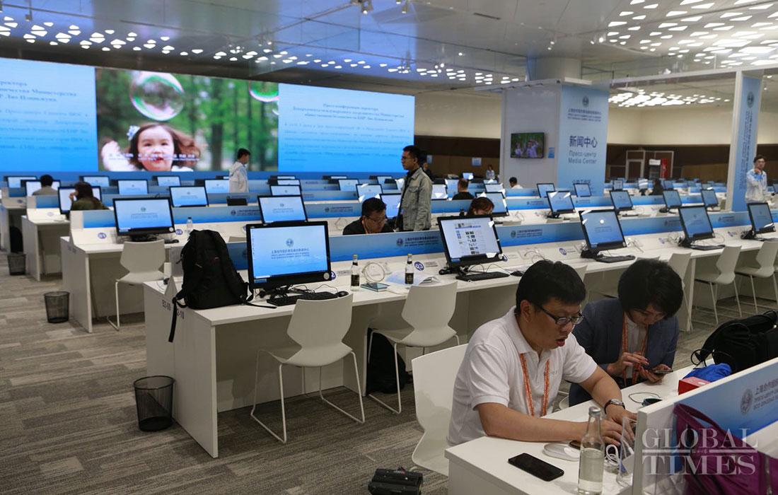 Journalists prepare in the media center of the Shanghai Cooperation Organization Qingdao Summit in Qingdao, East China's Shandong Province, on June 7, 2018. Photo: Li Hao/GT figcaption >