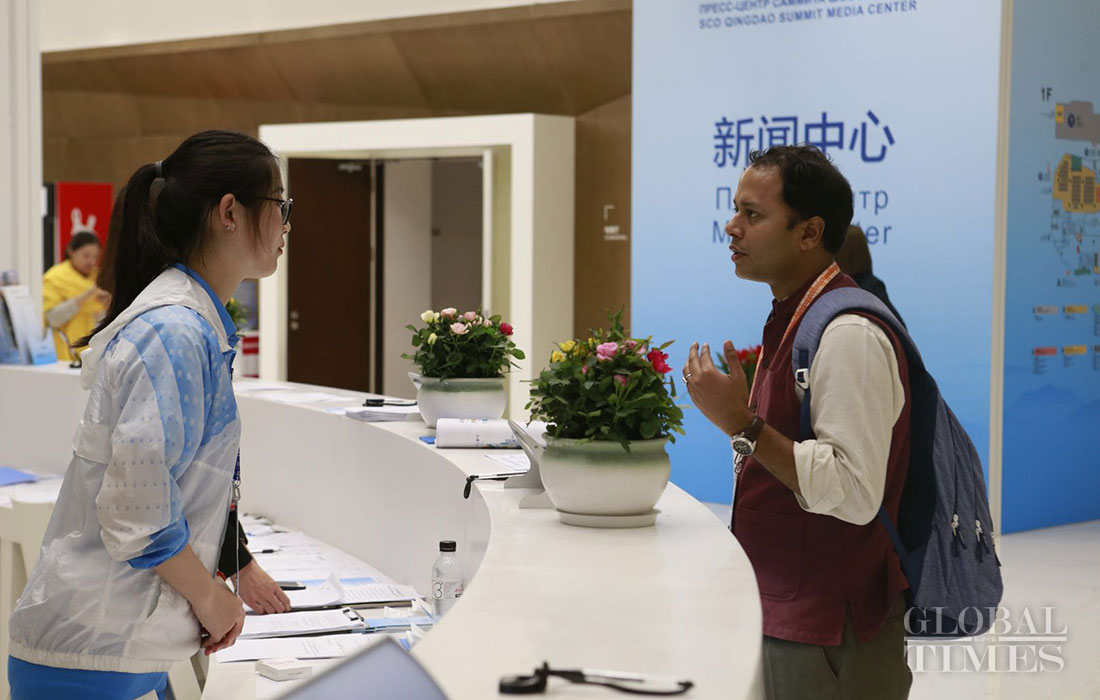 A volunteer helps a reporter who is asking for information at the media center reception desk of the 18th Shanghai Cooperation Organization Summit in Qingdao, East China's Shandong Province, on June 7, 2018. Photo: Li Hao/GT figcaption >