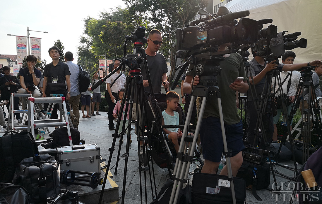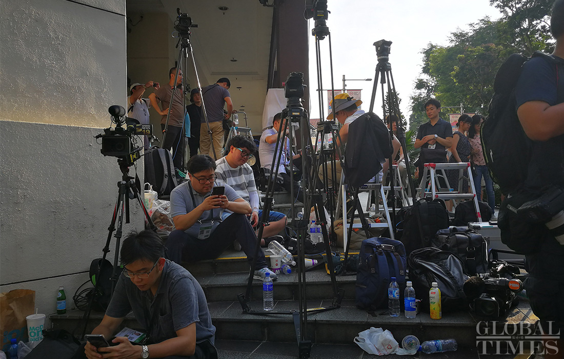Journalists prepare outside the St. Regis hotel where North Korean leader Kim Jong-un has stayed in Singapore on Sunday. Photo: Cui Meng/GT figcaption >