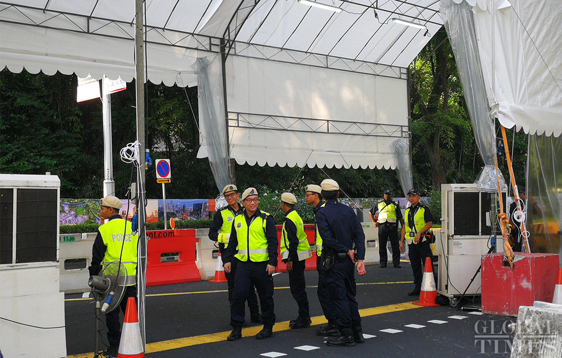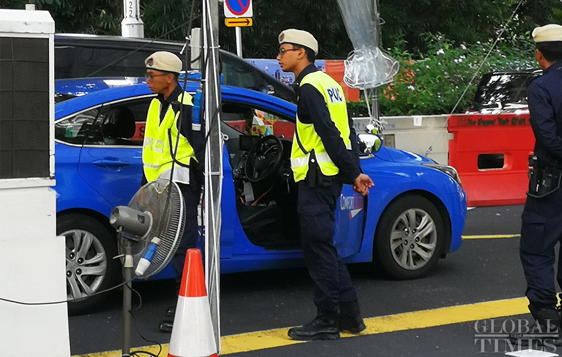 Singaporean police stand at a checkpoint set up outside the St. Regis Hotel on Sunday where North Korean leader Kim Jong-un is staying. Photo: Yang Sheng/GT figcaption >