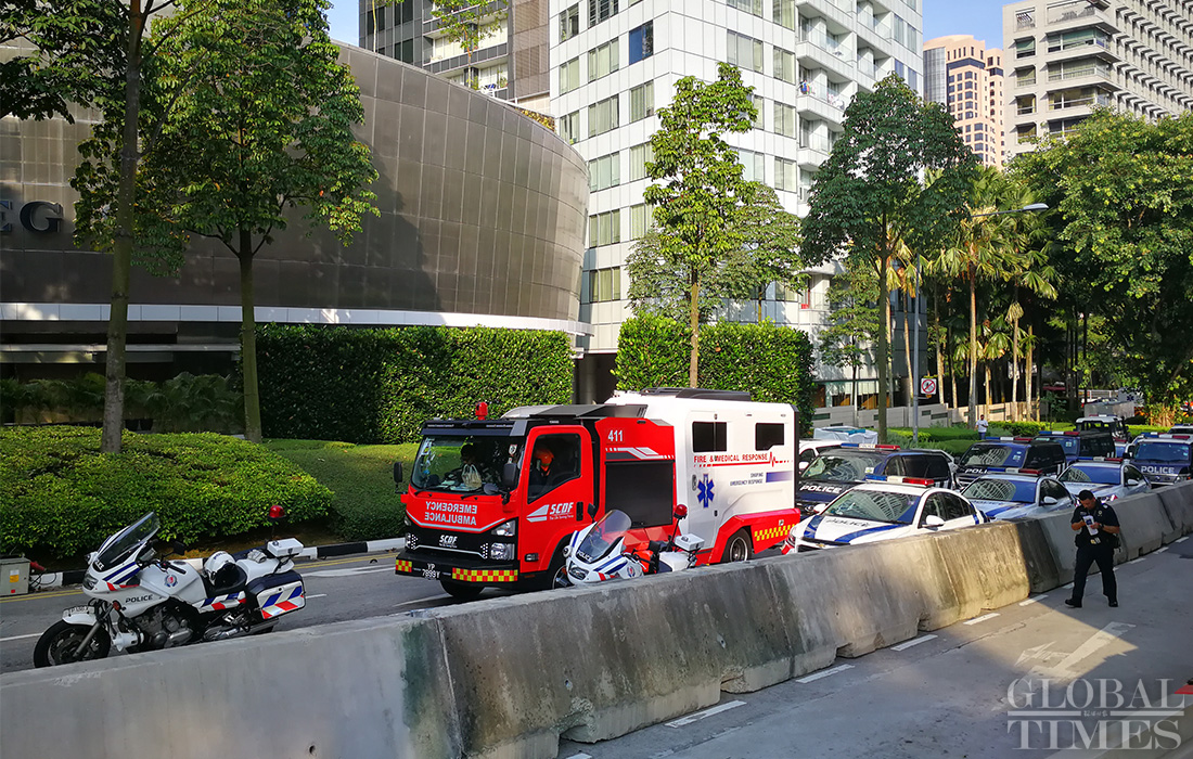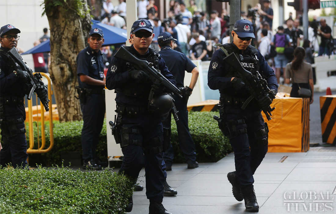 Singaporean police on patrol to ensure the security outside the St. Regis hotel where North Korean leader Kim Jong-un has stayed on Sunday. Photo: Cui Meng/GT figcaption >