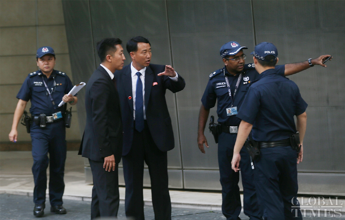 Related staffs coordinate security matters with the police outside the St. Regis hotel where North Korean leader Kim Jong-un has stayed in Singapore on Sunday. Photo: Cui Meng/GT figcaption >